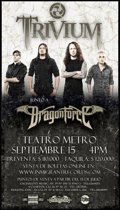 Boletas concierto TRIVIUM y DRAGONFORCE en Colombia 2012, Sep 15 Teatro ElDorado ECCI de Bogota