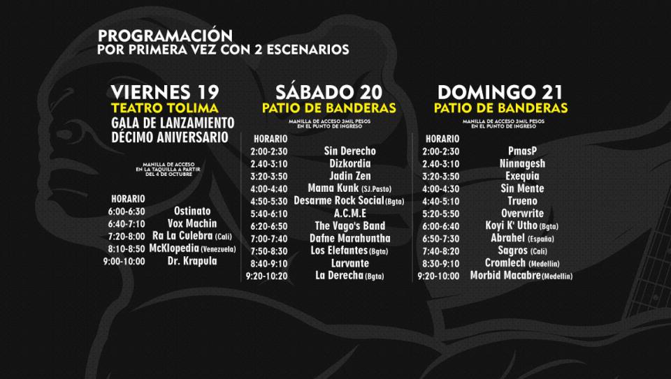Diez años haciendo historia en el movimiento nacional ha consolidado a Ibague Ciudad Rock como uno de los festivales con presencia en el circuito nacional y este año con la misma motivación de ampliar el cartel ya sea con nuevas propuestas o grandes clásicos el festival demuestra porque el emprendimiento del segundo festival mas antiguo de Rock en el país ha logrado contribuir en los proyectos de diversos artistas Nacionales e Internacionales.