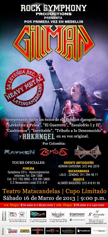 Marzo es el mes que reunirá grandes exponentes del Rock y Metal desde Latinoamericano hasta Europeo en Medellin ya que sumándose a los confirmados “THEATRES DES VAMPIRES- THE FALLACY el 2 de Marzo y ROTTING CRHIST el 23 de Marzo, el turno es para una de las leyendas del Rock Latinoamericano Paul Gillman después de mas de 30 años de carrera musical llega por primera vez a la capital de Antioquia.