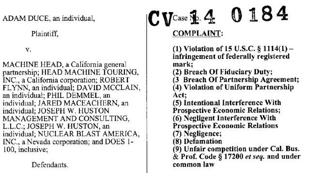Luego de haber anunciado la salida del bajista ADAM DUCE de MACHINE HEAD el pasado febrero, hoy el ex-bajista ha decido demandar al grupo argumentando que simplemente fue despedido sin motivo alguno.