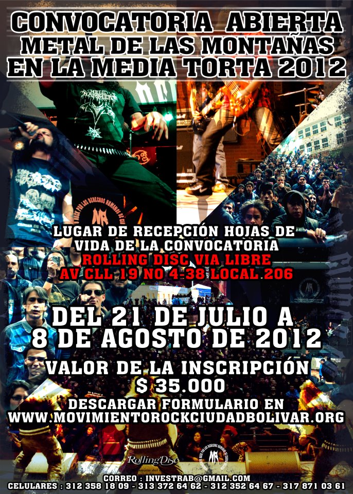 La segunda edición del Metal de las montañas 2012 organizado por el movimiento Rock Ciudad Bolivar abre su convocatoria para las bandas que quieran participar de esta edición que se llevara acabo en el Centro Cultural aire libre la Media Torta, la convocatoria esta abierta del 21 de Julio al 8 de Agosto.