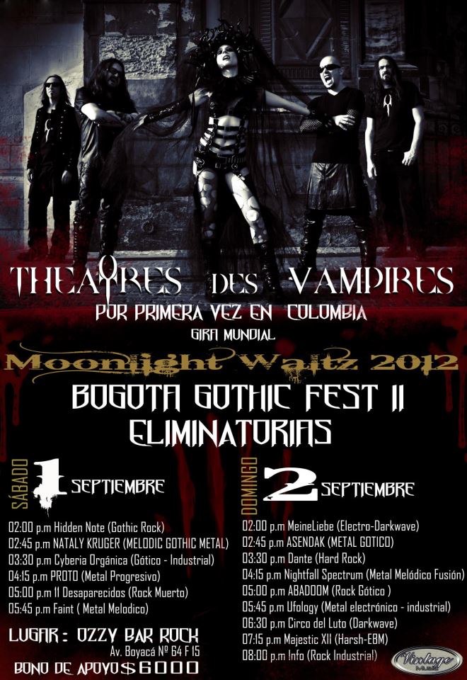 Llega la recta final de la eliminatoria de bandas que harán parte del cartel final del Bogota Gothic Fest II y acompañaran a Theatres Des Vampires! Pronto será publicado el cartel oficial de los diseñadores que nos acompañaran en el fashion show, este festival sera la oportunidad para mostrar un gran despliegue de creatividad dentro de la escena Gotica Bogotana!