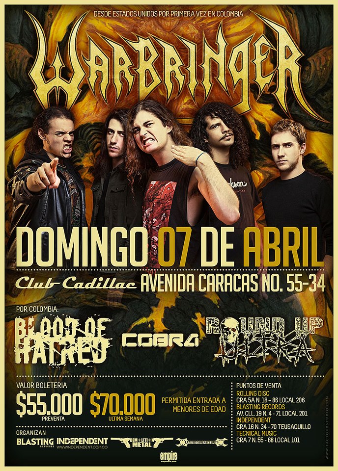 El quinteto de thrash metal californiano, WARBRINGER confirma su visita por Colombia para el proximo 7 de abril acompañado de las agrupaciones COBRA, BLOOD OF HATRED y ROUND UP ULTRA.