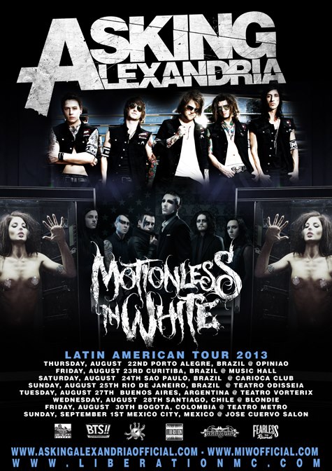 La agencia brasileña Liberation Music Company revela oficialmente la visita del quinteto ingles, ASKING ALEXANDRIA por territorio latinoamericano acompañados por los norteamericanos, MOTIONLESS IN WHITE para la segunda mitad de agosto, comienzos de septiembre.