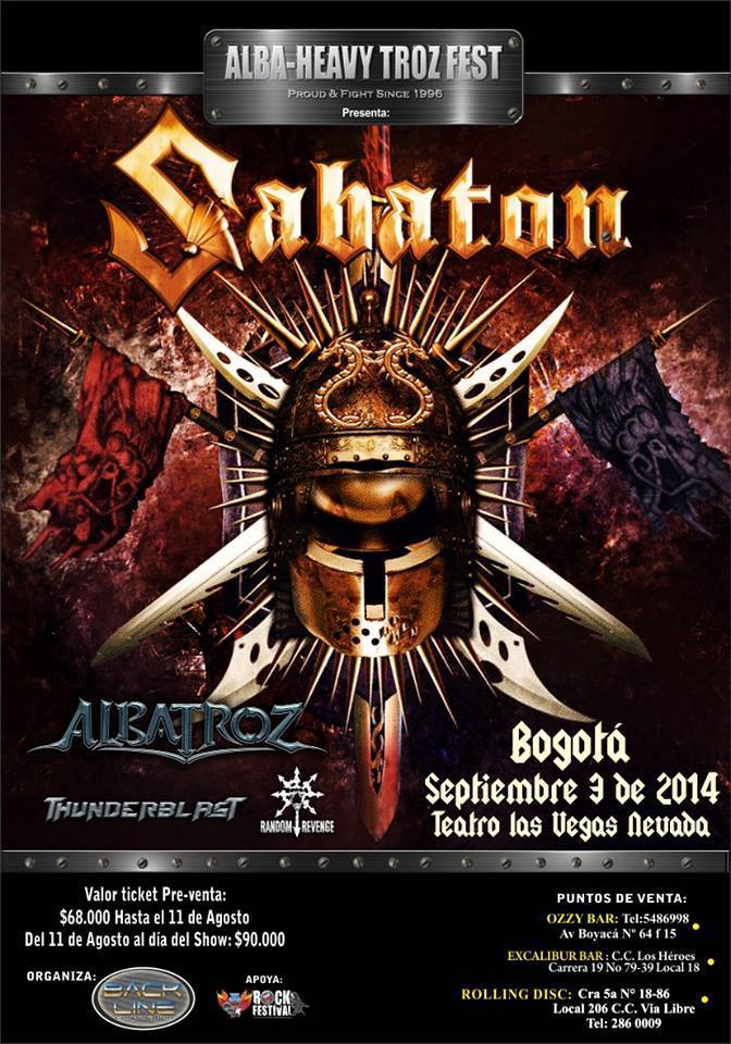 Finalmente se confirma la gira de SABATON por Sudamerica para el mes de septiembre incluyendo una fecha en Colombia.