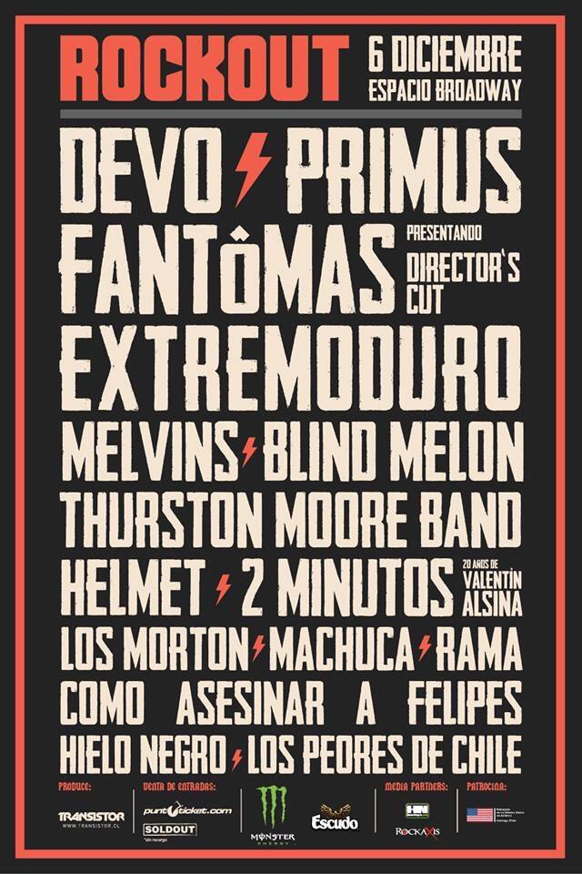 ROCKOUT FEST 2014 (Chile): FANTOMAS + MELVINS + HELMET… El Reverendo 11 years ago Continúan los grandes carteles en Sudamerica, esta vez se trata de ROCKOUT FEST el cual se llevara en Chile el proximo 6 de diciembre reuniendo a bandas como FANTOMAS, MELVINS, HELMET… Este es el cartel completo de la jornada: