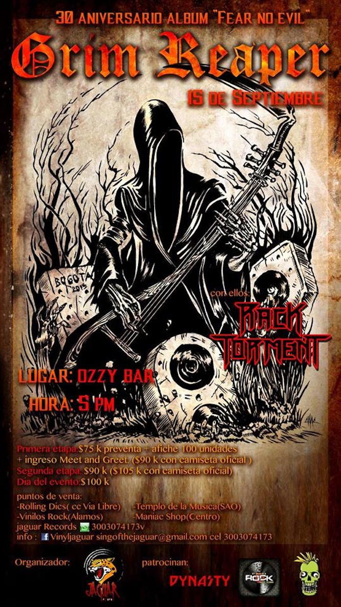“Después de la grandiosa presentación de Satan en Bogota Jaguar Records tiene el gusto de Presentar a otra tremenda banda de la NWOBHM Grim Reaper !!!! ,ellos celebraran los 30 años de se majestuoso Fear no Evil en Nuestro País !! “