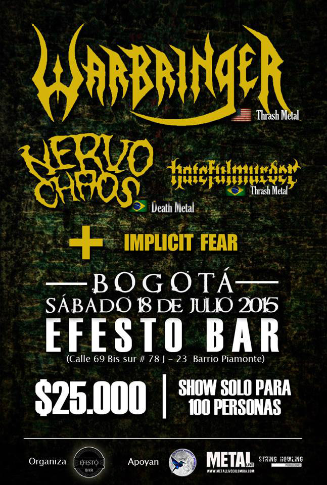 Las agrupaciones internacionales WARBRINGER (Estados Unidos) y NERVO CHAOS (Brasil) se estaran presentando en Bogota el proximo 18 de septiembre y bajo el marco del FESTIVAL CUERDAS DE ACERO OPEN AIR el 19 de julio en el Centro Turistico Internacional El Pedregal Yumbo.