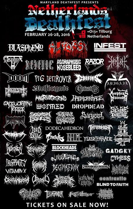 Los organizadores del festival norteamericano Maryland Deathfest han decidido organizar un evento en Europa bajo el nombre NETHERLANDS DEATHFEST el cual se llevara a cabo el proximo 26, 27 y 28 de febrero 2016 en Tilburg, Holanda.