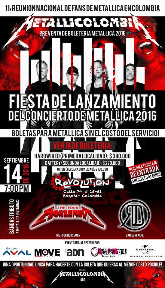 Fiesta de lanzamiento concierto de Metallica en Colombia 2016, Sep 14 en Revolution Bar de Bogotá