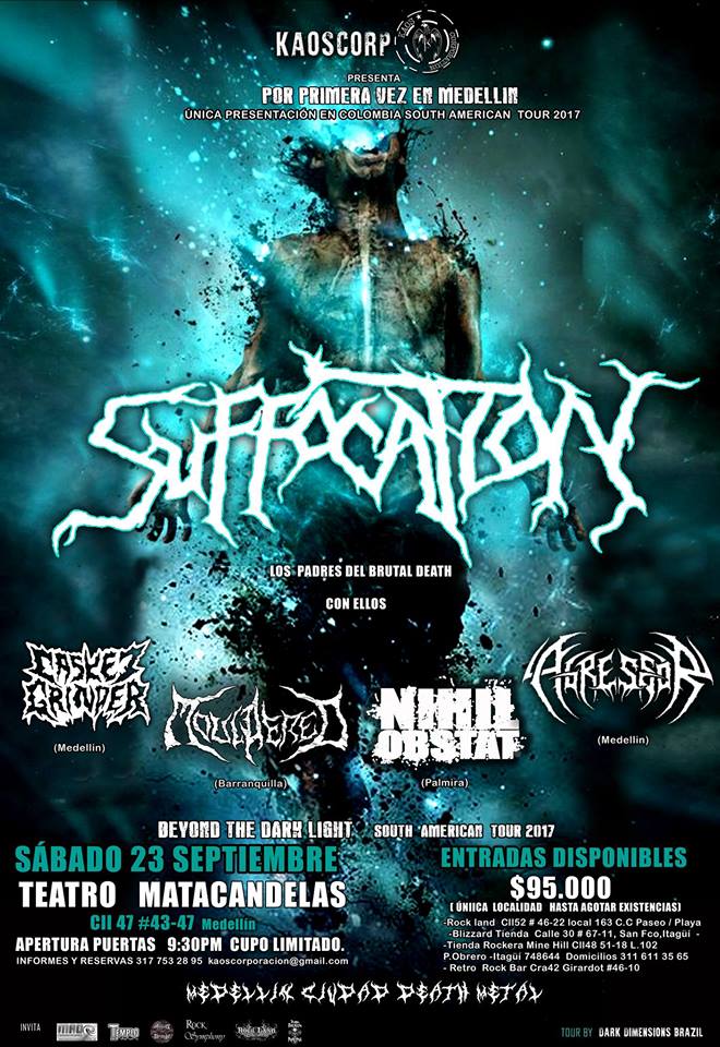 Luego de haber anunciado su regreso por Sudamérica, SUFFOCATION confirma una fecha para Colombia bajo el marco de su gira “Beyond The Dark light South American Tour 2017”.