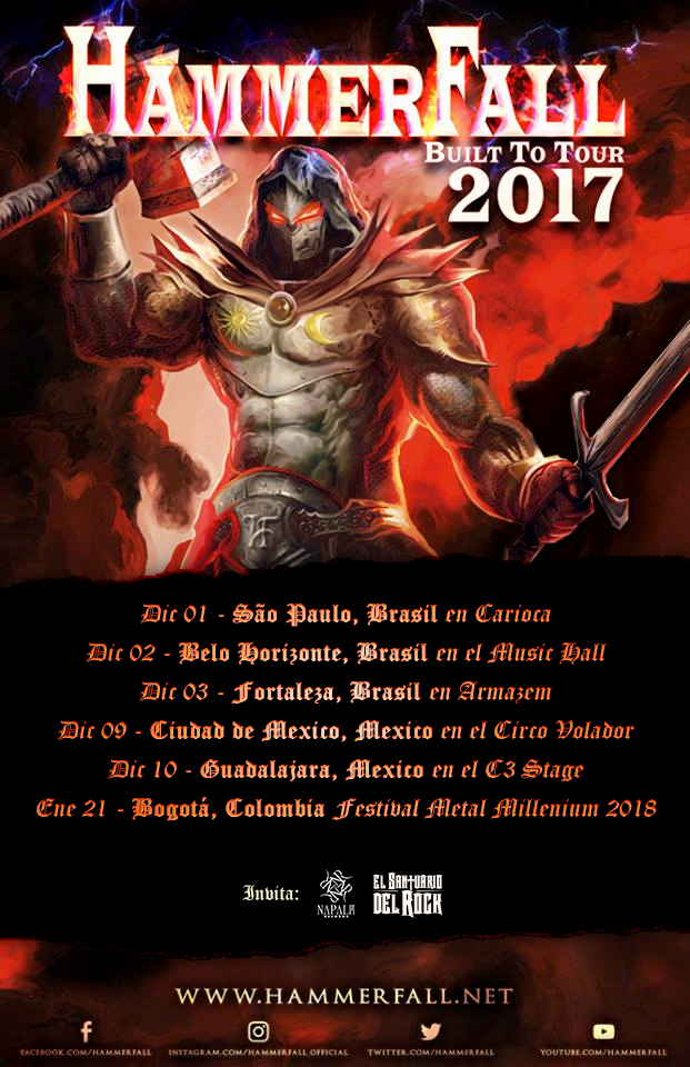 El quinteto sueco HammerFall confirma su gira por Latinoamérica 2017 para el mes de Diciembre bajo el marco de su “Built to Tour 2017”, la gira iniciará en São Paulo, Brasil en el Carioca Club.