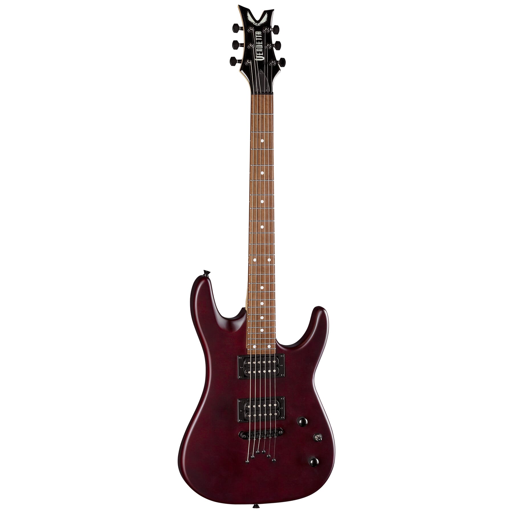 La Dean Vendetta XM viene en dos versiones: una con tremolo (whammy bar) y otra con hardtail (puente fijo). Ambas comparten un acabado natural satin, con un toque de rojo profundo que le da un estilo moderno y agresivo. El cuerpo de la guitarra está hecho de madera de álamo (poplar), mientras que el mástil es de arce con una tapa de nogal negro. El clavijero, con el logo de Dean y la inscripción “Vendetta”, tiene un diseño curvado que resalta su estética.